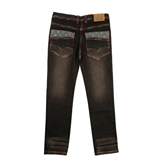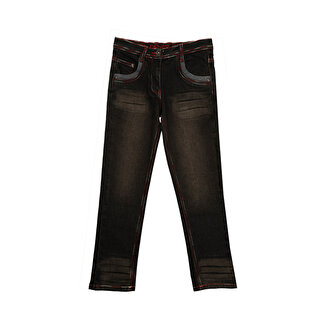 Ровные джинсы, слегка заужены к низу, декорированы цветной строчкой и клепками на карманах.
