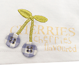 Белая футболка, спереди, украшена небольшим принтом, в виде вишенки, из декоративных пуговиц.