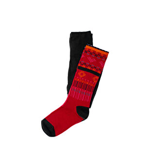 Дополняют комплект черные колготки с ярким принтом.