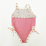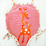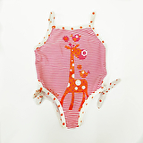 Полосатый закрытый купальник на тонких брителях. На бедрах завязки для регулирования размера. Украшен оригинальной апликацией — "жирафик с птичками" Эластичный быстросохнущий материал обеспечивает идеальную посадку.