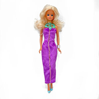 Лялька з милими рисами обличчя, у неї довге, розкішне золотисте волосся.