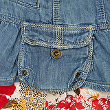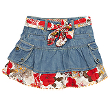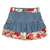 Джинсовая юбка голубого цвета, с ярким тканевым воланом в цветочек. прекрасно подойдет для наряного образа.