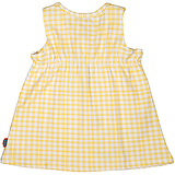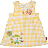 Светло-желтая туника свободного кроя с тонкой резинкой на груди и присобраными плечиками, декорирована цветочным принтом и вышивкой с логотипом бренда.